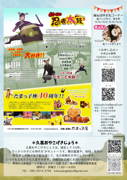 - 『どうぶつ忍者太鼓』(たまっ子座)こどもライブフェスタ2025in久喜 チケット申し込み受付を開始しました!