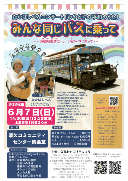 - 【鑑賞会のお知らせ】たかはしべんコンサート「おやと子の平和のうた」 みんなおなじバスに乗って